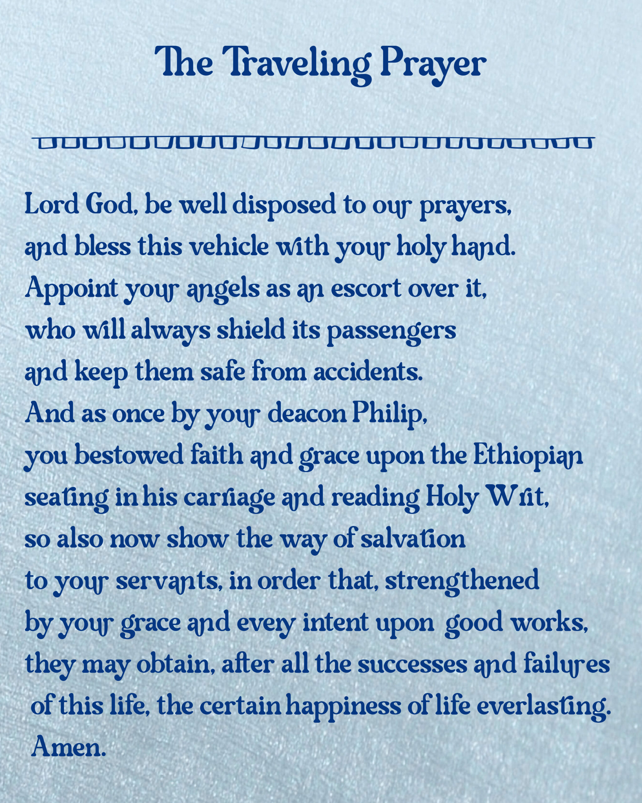 Lord God, be well disposed to our prayers, and bless this vehicle with your holy hand. Appoint your angels as an escort over it, who will always shield its passengers and keep them safe from accidents. And as once by your deacon Philip, you bestowed faith and grace upon the Ethiopian seating in his carriage and reading Holy Writ, so also now show the way of salvation to your servants, in order that, strengthened by your grace and every intent upon good works, they may obtain, after all the successes and failures of this life, the certain happiness of life everlasting. Amen.